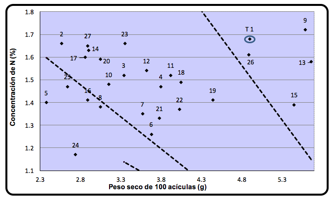 Para el estado nutrimental de los brinzales, en respuesta a los tratamientos, se hizo el análisis gráfico de vectores (Timmer y Stone, 1978). Para ello, se obtuvo el peso seco de 100 acículas (PS 100), provenientes de la parte media de la ramilla de cada muestra, las cuales correspondieron a tres de las 10 repeticiones de cada tratamiento, y se recolectaron el 15 de enero del 2014, de ramillas totalmente maduras, no senescentes, localizadas en el tercio superior de la copa de los brinzales (Wells y Allen, 1985).