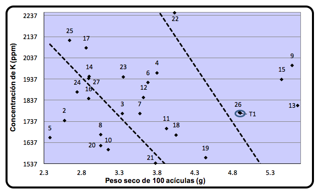 No obstante que las concentraciones de K fueron más bajas (<0.2237 %) que las concentraciones medias de K en el follaje de coníferas (0.55 %) (Hernández y Torres, 2009); en general, las concentraciones foliares de K en el presente experimento se incrementaron al aplicarlo (Figura 6). Esto implica que el K no es limitante del crecimiento y que existe otro factor, que propicia que dicho elemento presente un efecto de concentración en el follaje (López-López y Alvarado-López, 2010). Ese diagnóstico coincide con el impacto negativo y significativo del K sobre el peso seco de 100 acículas (Figura 2).