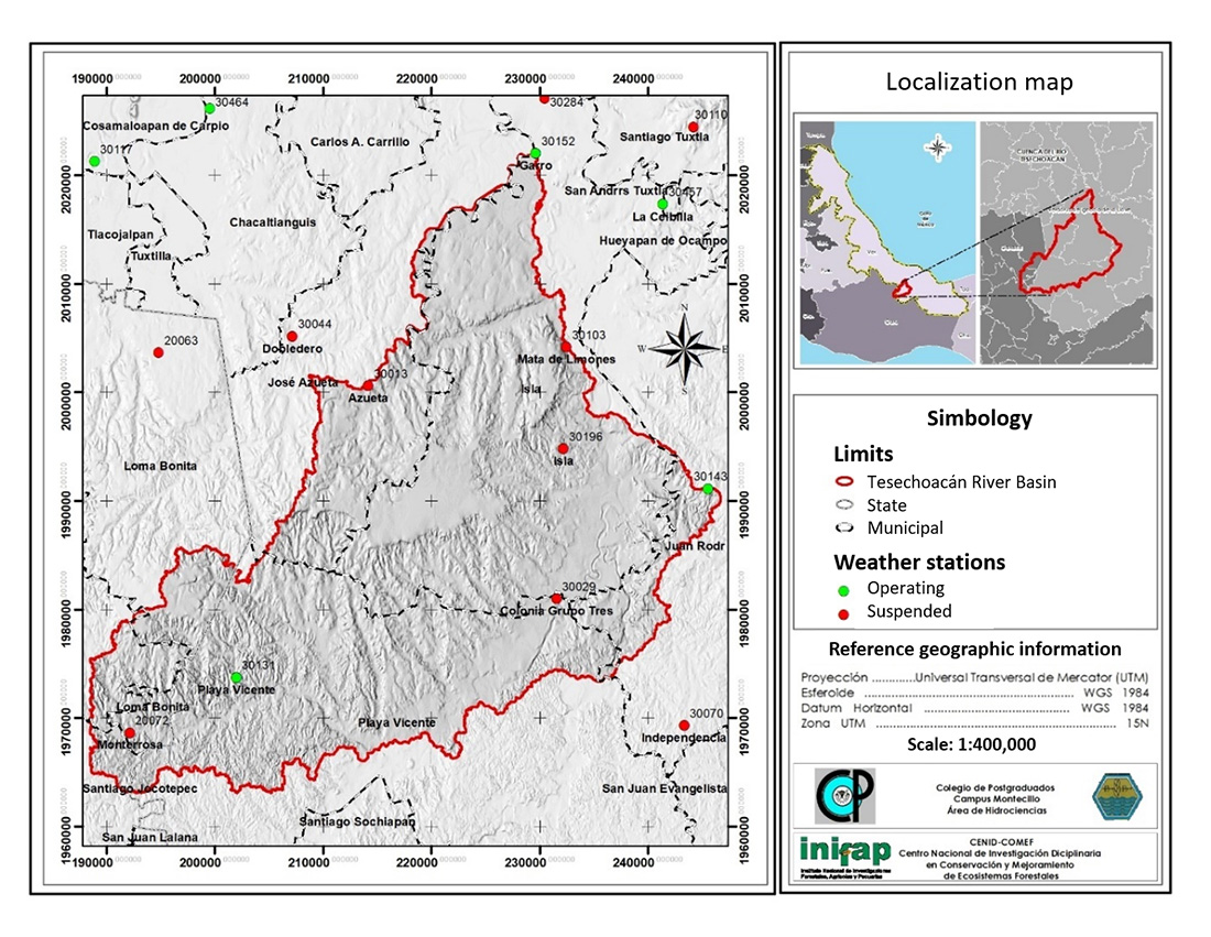 The Tesechoacán river is one of the main tributaries of the Papaloapan river basin, which is part of Hydrological Region 28-B and is divided into 24 sub-basins; that of the Tesechoacán river includes the confluence of the Playa Vicente and Manso river, up hydrometric station 28 136 (Garro). It is located in the states of Veracruz (90.8 %) and Oaxaca (9.2 %) and encompasses seven municipalities (Figure 1), with a population of 355 250 inhabitants.