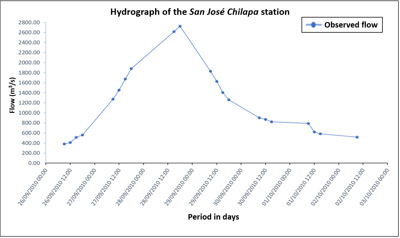Hydrometric information. Information was obtained from hydrometric station 28 143 (San José Chilapa), located in the upper part of the sub-basin (17°47'60.00"N, 95°51'20.03"W). The data used for the scenario of interest corresponds to the Hurricane Matthew event from September 26th to October 1st, 2010. The hydrograph was superimposed on the upstream river for the main riverbed inflow. Data from station 28 143 corresponding to the period 1974-2014 were used in order to know the impacts of runoff on the middle and lower part of the watershed, and to compare them with the available satellite image.
