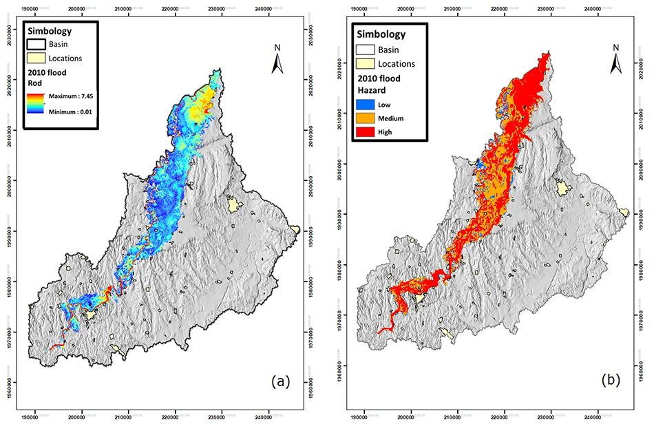 Figure 4. Flooded areas (a) and hazard map of the sub-basin (b).