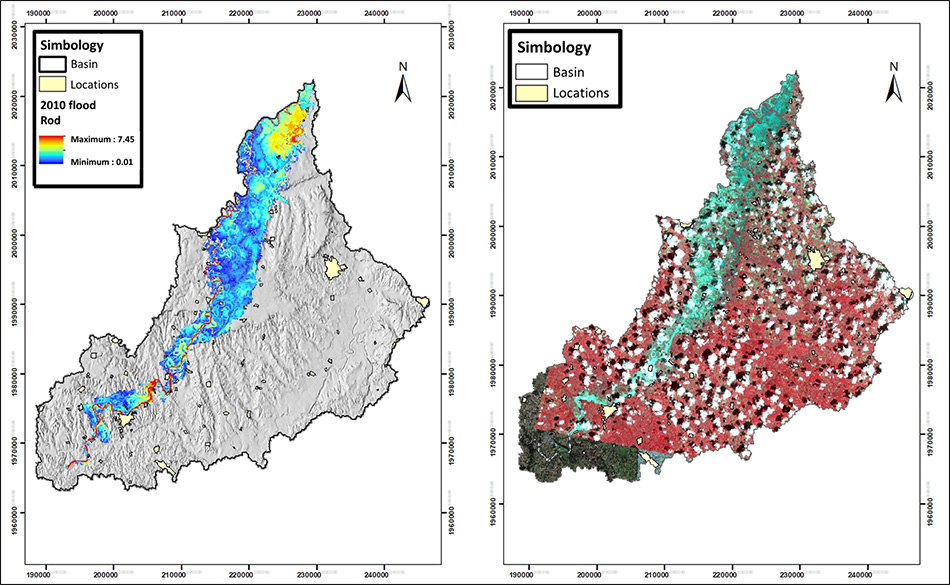 The flooding surface was validated with satellite images available for the period to be simulated. A SPOT 4 image (HRVIR 1) of four multispectral bands (R, G, NIR and MIR), with resolution at 20 m, was obtained for October 10, 2010. A geometric correction was made to this image in Qgis 3.6 in order to transpose it to the required cartographic projection.