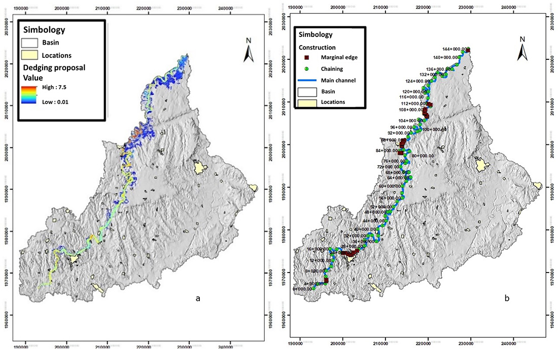 Based on the results of the hydraulic modeling and the structural and non-structural solution alternatives classified by Conagua (2011), the generation of hazard maps and areas susceptible to flooding is suggested as a non-structural measure. In regard to structural measures, it is proposed to clear and clean riverbeds in the main eroded areas. For this purpose, a simulation was carried out in which the modification of the riverbed was proposed, with a 2-meter channel clearance and a 50 % widening of the banks along 113.250 km of the riverbed. In addition, it was suggested to make a dike with a rectangular crown. Figure 7a shows the result.