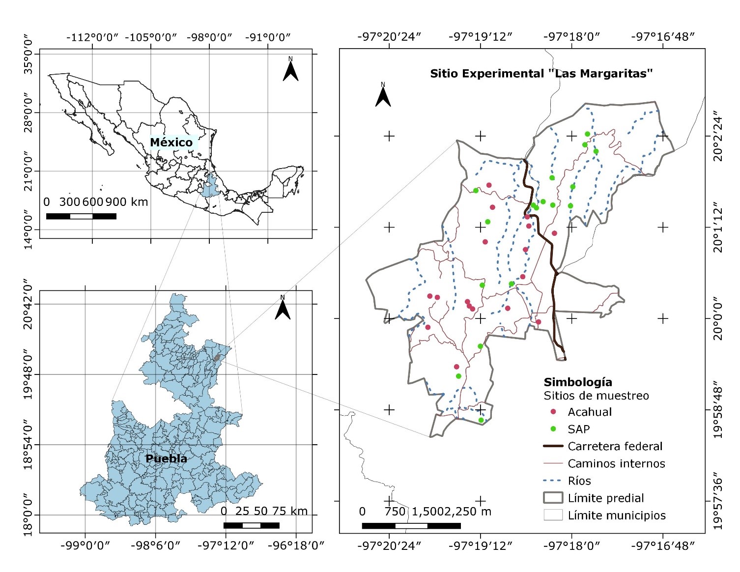 El estudio se realizó en los bosques tropicales del Sitio Experimental Las Margaritas, localizado al noroeste del estado de Puebla entre los municipios Hueytamalco y San José Acateno (Figura 1), tiene una superficie de 2 523 ha, 84 % cubierta por Selva alta perennifolia y acahuales.