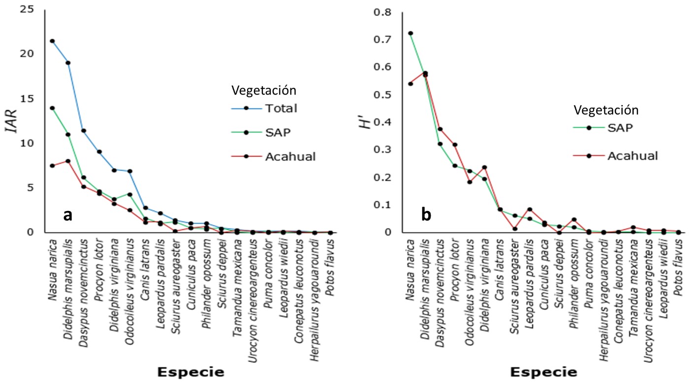 Los taxones presentaron diferentes abundancias relativas en las dos condiciones de vegetación estudiadas (Figura 4a). Nasua narica, Didelphis marsupialis Linnaeus, 1758 y Dasypus novemcinctus Linnaeus, 1758fueron las más abundantes para ambas condiciones, mientras que Herpailurus yagouaroundi y Puma concolortuvieron los menores valores y solo se registraron en la SAP; L. wiedii únicamente se observó en el acahual.