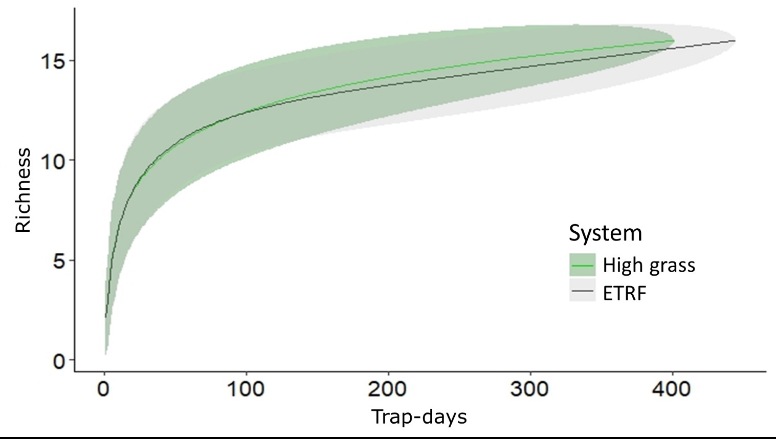 La riqueza de especies de la SAP y el acahual se estimaron con el conteo de especies registradas para cada unidad de esfuerzo de colecta y se compararon mediante una prueba de t-Student para muestras independientes. Se generó una matriz de presencia-ausencia para estimar la riqueza de mamíferos mediante el método de rarefacción con la paquetería Vegan del programa R (Oksanen et al., 2014). Con esta información se generaron las curvas de acumulación de especies por condición de vegetación.