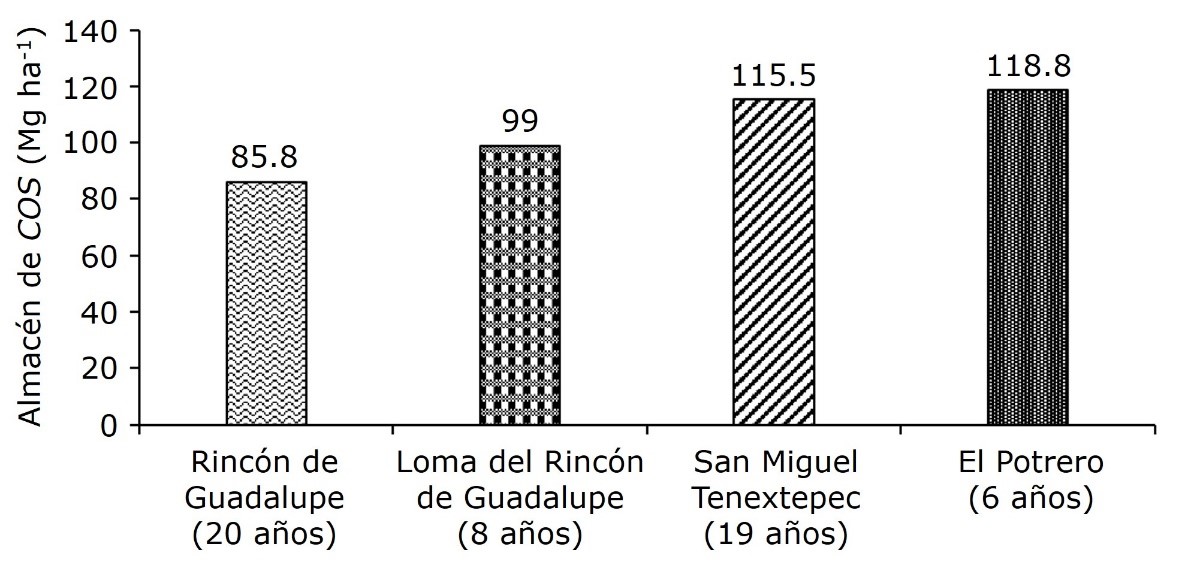 El almacén de C del suelo es importante en la mitigación del cambio climático. El suelo tiene la capacidad de almacenar más C que la biomasa aérea, pero para que ocurra, se requiere del suministro constante de material vegetal (Ontl y Schulte, 2012). Los almacenes de COS de los suelos se muestran en la Figura 2. El suelo de la plantación de El Potrero almacenó 38.5 % más C que en Rincón de Guadalupe, 15.4 % más que en Loma del Rincón de Guadalupe y 3 % más que en San Miguel Tenextepec. La menor cantidad de C almacenado en las plantaciones de Rincón de Guadalupe y Loma del Rincón de Guadalupe se debe a su previa vocación agrícola. En la plantación de El Potrero, aunque la parcela fue de vocación agrícola en el manejo de la plantación se hicieron aportes de fertilizantes orgánicos (estiércol), lo cual explica el mayor almacenamiento de carbono. Finalmente, en San Miguel Tenextepec el terreno conservó su vocación forestal, con ello se mantuvo un alto nivel de C en el suelo.