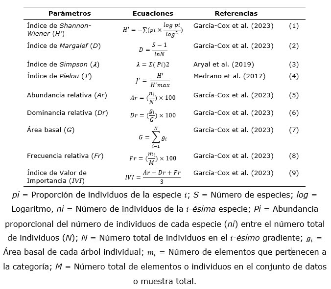 Se estimó la riqueza de especies (S), Índice de diversidad de Shannon-Wiener (H’), el Índice de Simpson (λ) e índices de equidad de Pielou (J’) y de dominancia de Simpson (Eλ) (Cuadro 2) (Jost & González-Oreja, 2012). El peso ecológico de las especies se determinó mediante el Índice de Valor de Importancia Ecológica (Medrano et al., 2017).