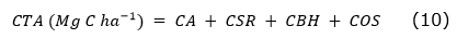 En cada parcela se recolectaron cinco submuestras de suelo a dos profundidades (0-10 y 10-30 cm), que posteriormente se homogeneizaron para obtener una muestra de suelo representativa para cada profundidad de suelo (Bravo-Medina et al., 2021). Para este estudio, el carbono total almacenado (CTA) resultó de la suma de los siguientes componentes: carbono aéreo (CA), carbono subterráneo de la raíz (CSR), carbono de la biomasa de la hojarasca (CBH) y carbono orgánico del suelo (COS) (López-Santiago et al., 2019). Sin embargo, esa Ecuación (10) puede estar formada por más o menos componentes según el criterio y el interés de los investigadores (Dantas et al., 2021; Pradhan et al., 2012).
