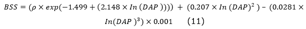 Para estimar el carbono almacenado en las palmas a lo largo del gradiente altitudinal, se utilizó la ecuación alométrica propuesta por Chave et al. (2005), adaptada para incluir todas las palmas con un diámetro a la altura del pecho DAP≥10 cm. La Ecuación 11 se basa en la densidad de la madera (ρ, en g cm3) y el DAP (en cm), y se expresa como sigue:
