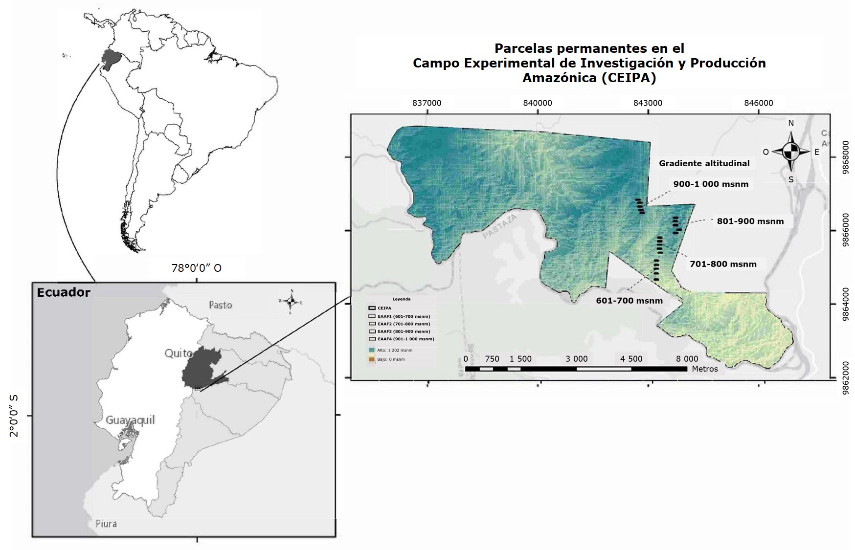El estudio se llevó a cabo en los bosques andino-amazónicos de la provincia de Napo, Ecuador en colaboración con el Centro Experimental de Investigación y Producción Amazónica (CEIPA), ubicado en la provincia de Pastaza, Cantón Carlos Julio Arosemena Tola, en el kilómetro 44 de la vía Puyo-Tena (Figura 1).