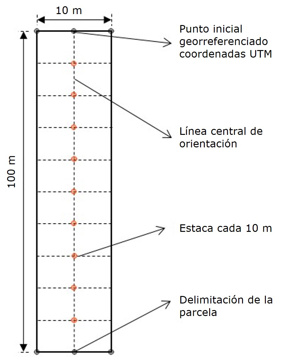 Se instalaron transectos permanentes, generalmente utilizados en el muestreo exploratorio rápido, denominados muestreo tipo Gentry (Gentry, 1982; Montufar & Pintaud, 2006), modificando las parcelas originales de 500×2 m a parcelas de 100×10 m (Figura 2), es decir de 0.1 ha-1 (García-Cox et al., 2023). De esta manera, en cada parcela se registró el número de individuos de las especies de la familia Arecaceae, los cuales se marcaron, colectaron, herborizaron y depositaron en el Herbario ECUAMZ–Ecuador Amazónico. La identificación taxonómica se realizó con el apoyo de claves, catálogos ilustrados y recursos digitales, como Tropicos (Bravo, 2014) y The Plant List (Neill, 2012), para asegurar la precisión en la nomenclatura (Cazzolla et al., 2022; Gentry, 1982; Ter Steege, 1998).