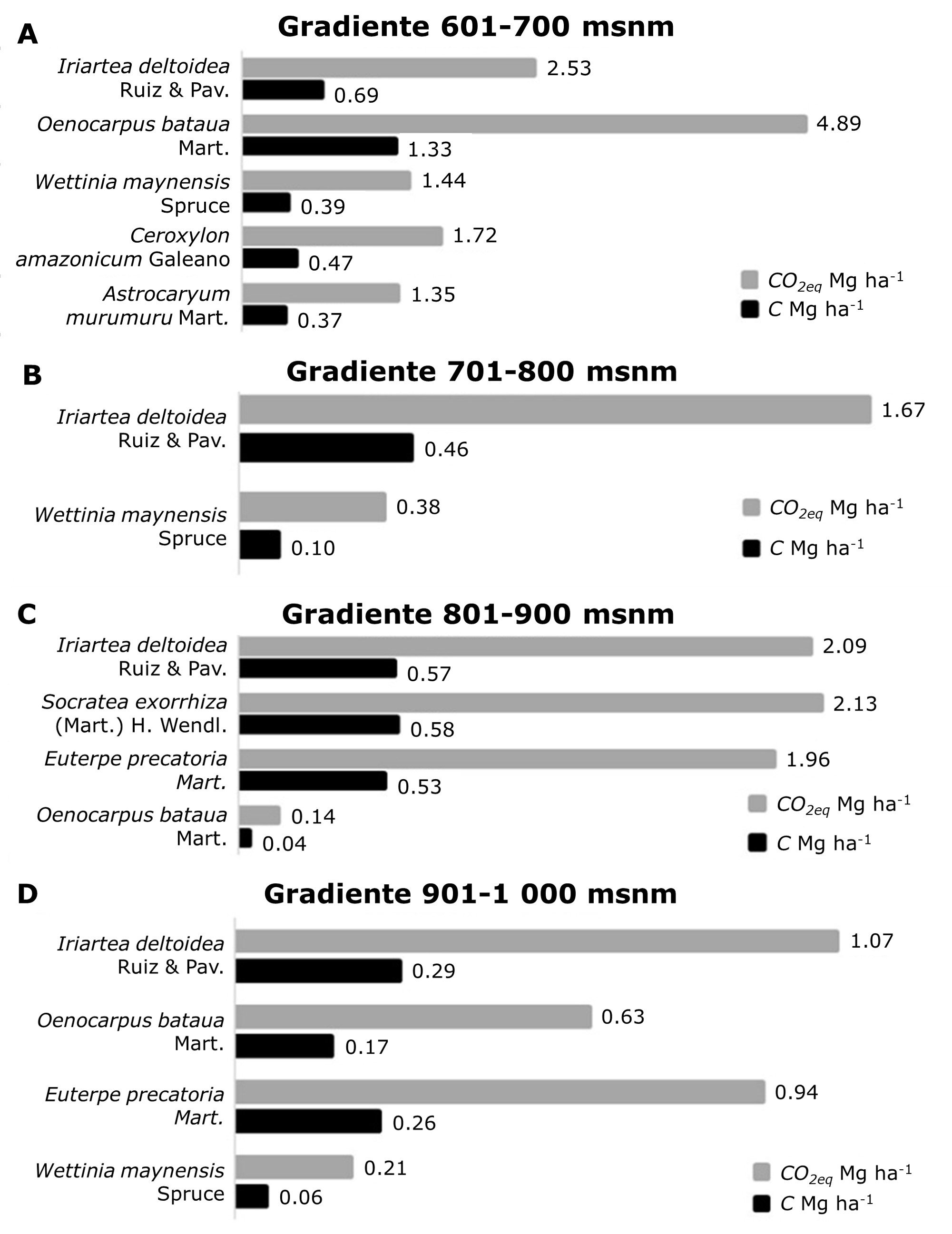 En la altitud de 701 a 800 msnm, el almacenamiento de carbono disminuye, con Iriartea deltoidea como la especie dominante (1.67 Mg ha-1 de CO2eq) (Figura 3B). De 801 a 900 msnm, se observa una ligera recuperación, con Socratea exorrhiza (Mart.) H. Wendl. (2.13 Mg ha-1 de CO2eq) e Iriartea deltoidea (2.09 Mg ha-1) como principales contribuyentes; mientras que Oenocarpus bataua muestra una caída significativa con solo 0.14 Mg ha-1 (Figura 3C). Finalmente, en el intervalo altitudinal de 901 a 1 000 msnm el almacenamiento disminuye en todas las especies, pero Iriartea deltoidea se mantiene como la dominante con 1.07 Mg ha-1 de CO2eq (Figura 3D).