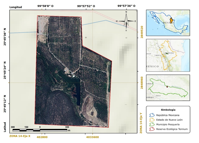 El área de estudio fue una superficie de 83.72 ha, localizada en el municipio Pesquería, Nuevo León, México (Figura 1), coordenadas 25°45′94.99″ N y 99°57′43.61″ O, y a una altitud de 305 m. El clima de la región se clasifica como seco-semicálido (BWhw), según la clasificación de Köppen modificada por García (García & Comisión Nacional para el Conocimiento y Uso de la Biodiversidad [Conabio], 1998). El suelo predominante es de tipo Vertisol pélico (Instituto Nacional de Estadística, Geografía e Informática [INEGI], 2014). La vegetación característica corresponde al Matorral Espinoso Tamaulipeco (MET) (Alanís-Rodríguez et al., 2021).