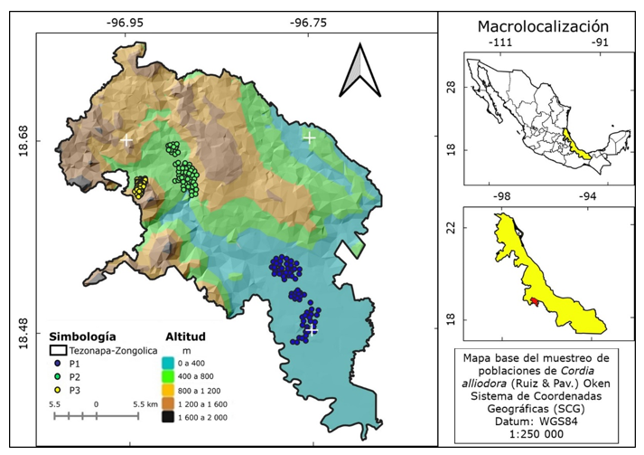 Los datos se recolectaron en árboles de C. alliodora asociados a SAFC, localizados en un gradiente altitudinal en los municipios Tezonapa y Zongolica, Veracruz, México. El área de estudio comprendió terrenos planos y de ladera, con altitudes de 60 a 1 150 m. En las zonas altas, la temperatura promedio es de 20 °C, con una precipitación anual de 1 500 a 2 000 mm y suelo Acrisol; para las zonas intermedias, la temperatura media es de 22 °C, con un registro de precipitación de 2 000 a 2 500 mm, predominan suelos de tipo Luvisol y Acrisol. En las zonas bajas, la temperatura promedio es de 26 °C, con precipitación de 2 500 a 4 000 mm y suelo tipo Luvisol (Instituto Nacional de Estadística, Geografía e Informática [INEGI], 2010a, 2010b).