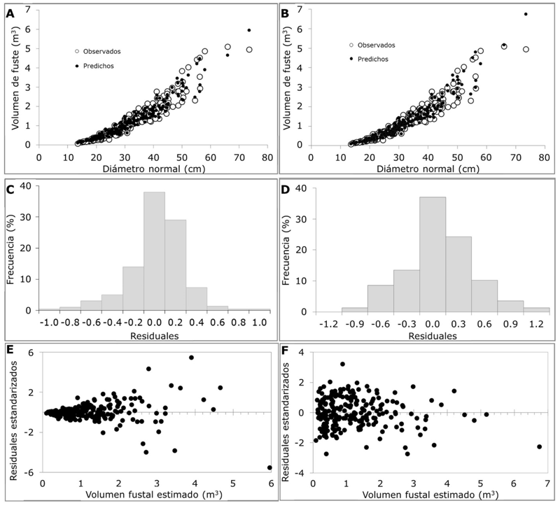 Los residuos del modelo seleccionado de Takata tienden a una distribución normal, pero su varianza no es estable; por lo tanto, se asume heterocedasticidad (Figura 2C y 2E). Por el contrario, al aplicarle la estructura como factor de ponderación se logró corregir satisfactoriamente la heterocedasticidad y se obtuvo una distribución homogénea de los residuos, conservando su distribución normal (Figura 2D y 2F). El valor estimado del exponente fue c=2.660; los estadísticos de bondad de ajuste del modelo corregido fueron: R2Adj=0.957, RCME=0.204 m3, AIC=-433.02, CV=16.7 %,