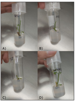 Germinación en condiciones asépticas. Se sembraron las 90 semillas en tubos de vidrio de fondo plano de 100×10 mm, una semilla en cada tubo, los cuales contenían 7 mL de medio MS suplementado con 1 mL L-1 de Plant Preservative Mixture (PPM, PhytoTech Labs®), 8.5 g L-1 de agar y 30 g L-1 de sacarosa, a un pH de 5.7; los tubos fueron sellados con tapas plásticas y cinta parafilm; se llevaron al cuarto de incubación en condiciones controladas de temperatura (25 °C), intensidad lumínica de 50 µmol m-2 s-1 y con un fotoperiodo de 16 horas de luz.