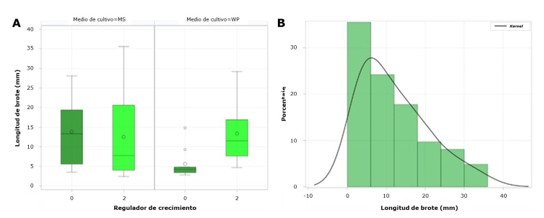 En investigaciones posteriores, se han empleado otros medios de cultivo y combinaciones hormonales que han mostrado efectos diferenciados en la longitud de los brotes. Campos-Ruiz et al. (2020) detectaron que el uso de 1 mg L-1 de BAP en medio Woody Plant Medium (WPM) favoreció la formación de brotes más largos, que alcanzaron los 8 mm. Mona (2012) obtuvo la mayor longitud de brote (39 mm) al utilizar medio MS suplementado con 2 g L-1 de carbón activado (CA), 4 mg L-1 de BAP y 0.4 mg L-1 de 2ip (6-γ-γ dimetil-1-alilaminopurina).