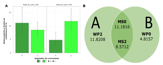 Bajo el modelo estadístico postulado y con nivel de significancia de 0.05, el ANOVA mostró que los efectos principales de los factores “medio de cultivo” y “concentración de BAP” no fueron significativos. Sin embargo, la interacción entre ambos factores fue altamente significativa (F=8.76, p-value=0.0045) (Cuadro 3). De hecho, mientras en MS la media desciende al pasar de la concentración 0 a la 2, en WP sucede lo contrario (Figura 3A).