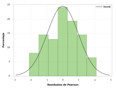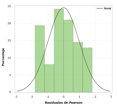 El análisis de normalidad de los residuales de Pearson, considerando los estadísticos de Kolmogorov-Smirnov y Cramer-von Mises, indicó que estos tienen una distribución normal (media 0 y desviación estándar de 0.9751). En ambos casos, el valor de p fue superior a 0.05. Asimismo, el histograma de los residuales, resultante del modelo estadístico postulado, fue simétrico (Figura 4).