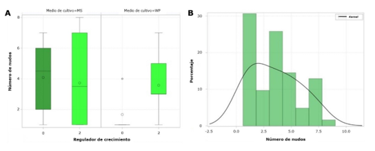 Las medias predichas por tratamiento se muestran en el Cuadro 8. MS0 y WP2 destacan por presentar medias superiores a 3 nudos y MS2 con un valor mayor a 2.5; en tanto que WP0 no alcanzó los 1.5 (Figura 6A). Con estos hallazgos, queda evidenciado que cuando WP0 no considera regulador de crecimiento, el número de nudos también se ve afectado.