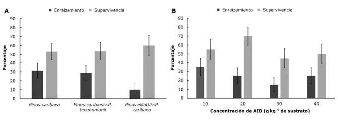 A = Factor taxón; B = Factor concentración de AIB. Barras de error expresan el error estándar.