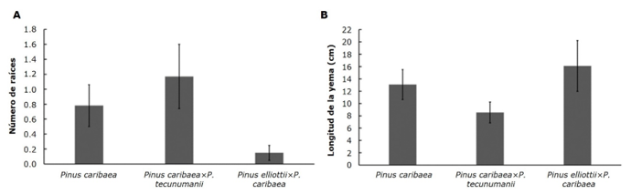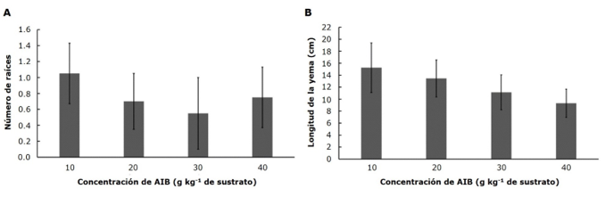 A = Valores promedios de número de raíces; B = Valores promedios de longitud de la yema. Barras de error expresan el error estándar.