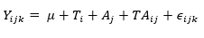 Yijk = Valor de la variable respuesta correspondiente al i-ésimo nivel de T (i=P. caribaea, P. elliottii × P. caribaea y P. caribaea × P. tecunumanii), j-ésimo nivel de A (j=10, 20, 30 y 40 g kg-1 de AIB en el sustrato) y k=1, 2, 3,… repeticiones