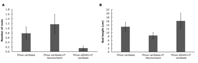 A = Number of roots generated; B = Length of the terminal bud. Error bars represent the standard error.