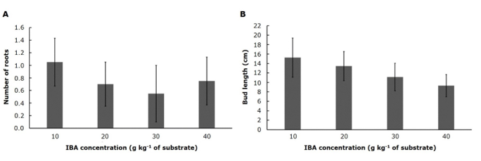 A = Average values of number of roots; B = Average values of bud length. Error bars represent the standard error.
