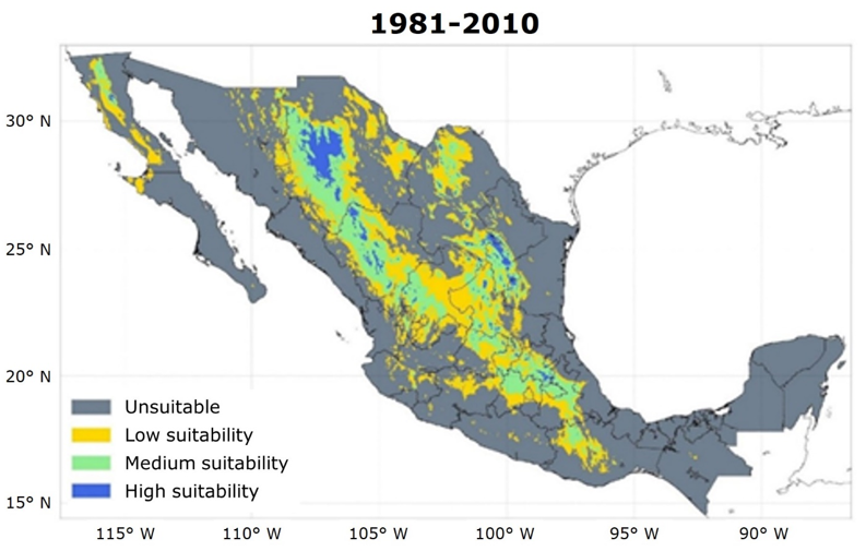 Areas classified as having low suitability were concentrated primarily in much of the Sierra Madre Oriental, the Sierra Madre Occidental and the Trans-Mexican Volcanic Belt, as well as in the Sierra de San Pedro Mártir, the Sierra de Juárez and the Mexican Plateau (states of Querétaro, Guanajuato, San Luis Potosí and Zacatecas). Areas of medium suitability were distributed in isolated strips of the Sierra Madre Occidental (states of Chihuahua and Durango) and the Sierra Madre Oriental (state of Nuevo León). In contrast, regions with high suitability were restricted to specific sectors of Chihuahua, Durango, Coahuila, Nuevo León, San Luis Potosí and Puebla.