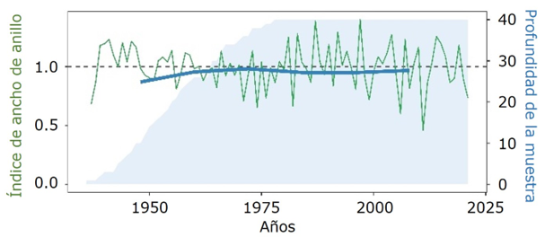 Los estudios dendroecológicos basados en el análisis de crecimiento radial permiten cuantificar indicadores de resistencia, recuperación y resiliencia tras perturbaciones extremas (Fang & Zhang, 2019; Lloret et al., 2011; Song et al., 2022). Combinado con el Índice Estandarizado de Evapotranspiración Precipitación (SPEI), facilita la evaluación del estrés hídrico (Vicente-Serrano et al., 2010) y su efecto en el Incremento en Área Basal (IAB), un indicador más preciso que el ancho de anillo para comparar la productividad forestal en el tiempo (Rojas-García et al., 2020; Serra-Maluquer et al., 2018).