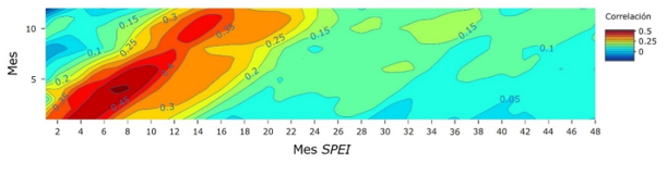 El crecimiento radial de P. menziesii presentó correlaciones positivas con el SPEI acumulado a escalas de 3 a 11 meses, particularmente entre marzo y julio (Figura 4). Los valores de correlación altos (>0.35) se concentraron en abril y mayo.