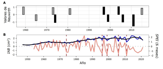 A = Años punteros: año puntero fuerte (gris) y extremo (negro); B = Variación temporal del IAB (línea azul, tendencia línea negra) y del índice SPEI a seis meses (línea naranja) para el periodo 1947-2021. Las líneas verticales discontinuas indican los años asociados a eventos de sequía severa.