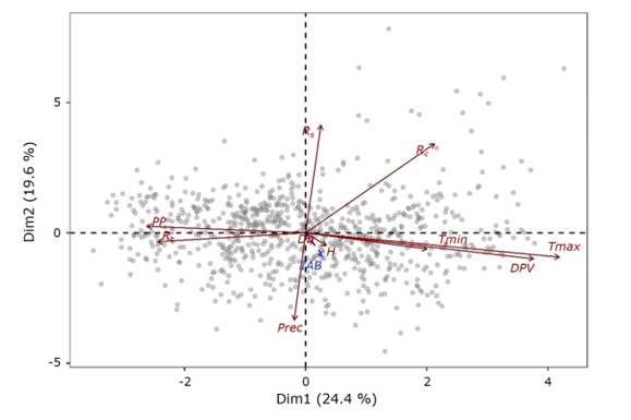 Dim1 = Primer componente principal, que explica la mayor proporción de la varianza total; Dim2 = Segundo componente principal, ortogonal a Dim1; PP = Precipitación; Rs = Índice de resiliencia; Rc = Índice de recuperación; Rt = Índice de resistencia; Tmin = Temperatura mínima; Tmax = Temperatura máxima; DPV = Déficit de presión de vapor; IAB = Incremento en Área Basal; Prec = Periodo de recuperación; Dn = Diámetro normal (cm); H = Altura total del árbol (m). Variables activas en vector de color café y el IAB como variable suplementaria en azul. Los puntos grises representan los individuos, y los vectores indican la dirección y magnitud de la influencia de cada variable sobre los dos primeros componentes principales.