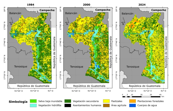 En 1984, el paisaje estuvo dominado por la vegetación secundaria (36.4 %) y los pastizales (33.7 %), seguidos por áreas agrícolas (13.0 %), vegetación hidrófita (8.0 %) y selva baja inundable (6.2 %). Los cuerpos de agua y los asentamientos humanos representaron proporciones menores a 3 % del área total (Cuadro 1; Figura 2).