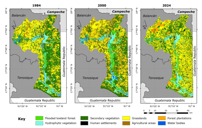 Multitemporal land-use change analysis using remote sensing techniques and geographic information systems has proven to be a robust tool for identifying spatial patterns, quantifying transitions between land cover types, and estimating rates of land gain and loss over different periods (Agudelo-Hz et al., 2023; Eastman, 2012). In tropical regions such as Southeastern Mexico, where floodplain forests, wetlands, and agricultural landscapes converge, this approach is particularly useful for documenting the replacement of native forest cover, the dynamics of secondary vegetation as transitional land cover, and the emergence of new productive uses.