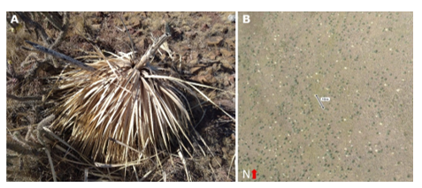 A = Planta de sotol muerta; B = Patrón espacial de la mortalidad en imagen RGB a 120 m de altura en Buenaventura (29°46′31″ N, 107°36′15″ O), Chihuahua, en 2021.