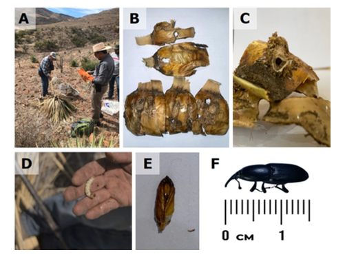 A = Muestreos de campo en 2024 (29°46′31″ N, 107°36′15″ O en Buenaventura; y 29°17′44.9″ N, 105°19′38.3″ O en Coyame); B = Perforaciones típicas del insecto en la base de las hojas; C = Perforaciones típicas del insecto en el capullo de pupación, anidado en la base de una hoja; D = Larva o gusano del picudo del agave (imagen cortesía del Sr. Fernando Porras); E = Pupa; F = Adulto.