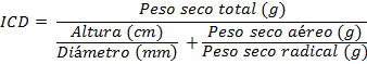 La relación parte aérea/raíz se obtuvo al dividir el peso seco aéreo (g) entre el peso seco radical (g) y el índice de esbeltez, al dividir la altura entre el diámetro del tallo (Thompson, 1985). El índice de lignificación corresponde al porcentaje de peso seco con relación al contenido de agua en las plantas (Prieto et al., 2004). El índice de Calidad de Dickson (ICD) resultó de integrar los valores de biomasa total, el índice de esbeltez y la relación parte aérea/raíz, en el que los valores altos indican plantas de mejor calidad (Dickson et al., 1960); su fórmula es la siguiente: