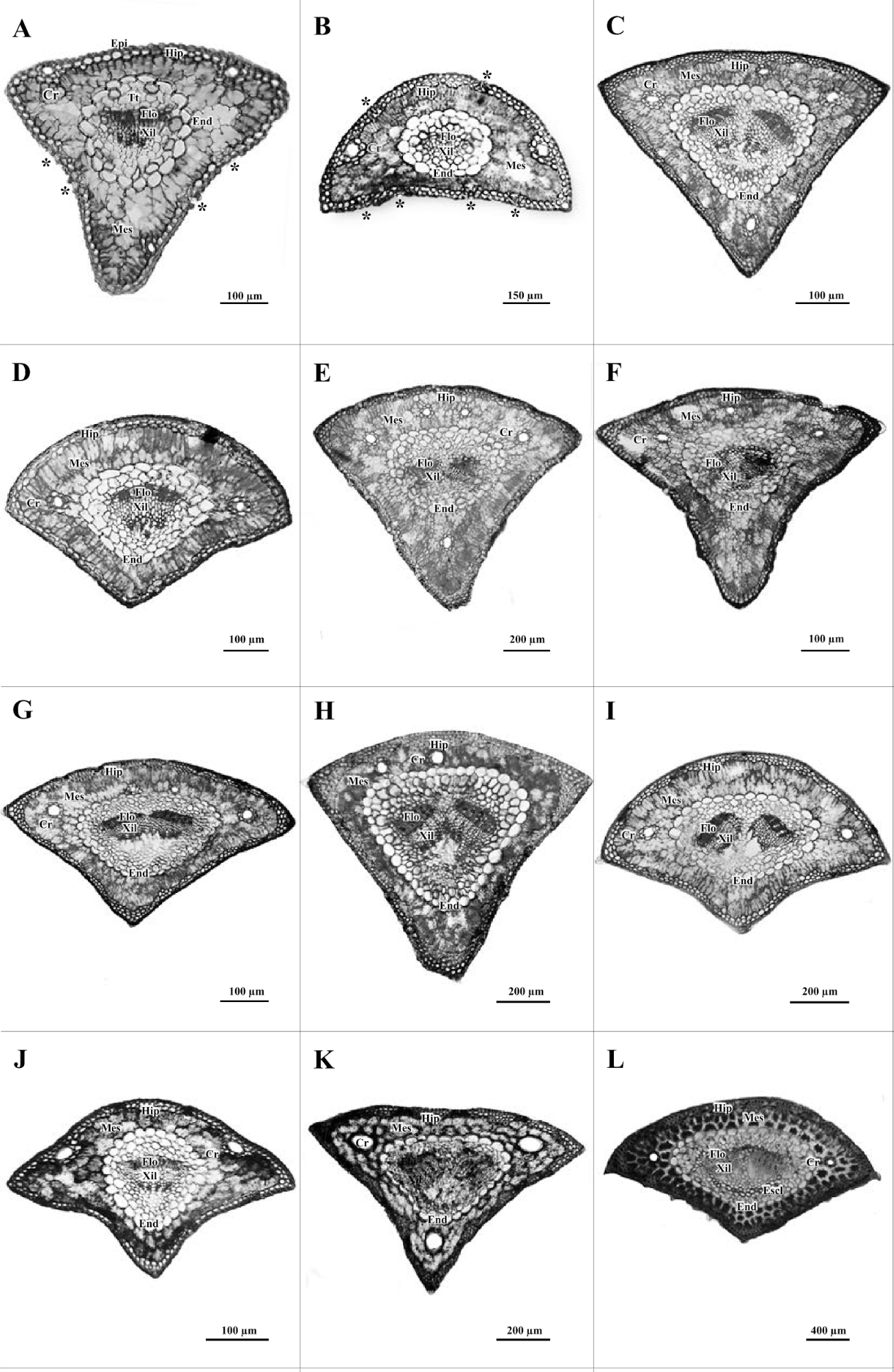 A = Pinus ayacahuite; B = P. cembroides; C = P. devoniana; D = P. greggii; E = P. hartwegii; F = P. leiophylla; G = P. montezumae; H = P. oocarpa; I = P. patula; J = P. pinceana; K = P. pseudostrobus; L = P. teocote; * = Indica la posición de los estomas; Cr = Canal resinífero; End = Endodermis; Epi = pidermis; Escl = Esclerénquima; Flo = Floema; Hip = Hipodermis; Mes = Mesófilo; Tt = Tejido de transfusión; Xil = Xilema.