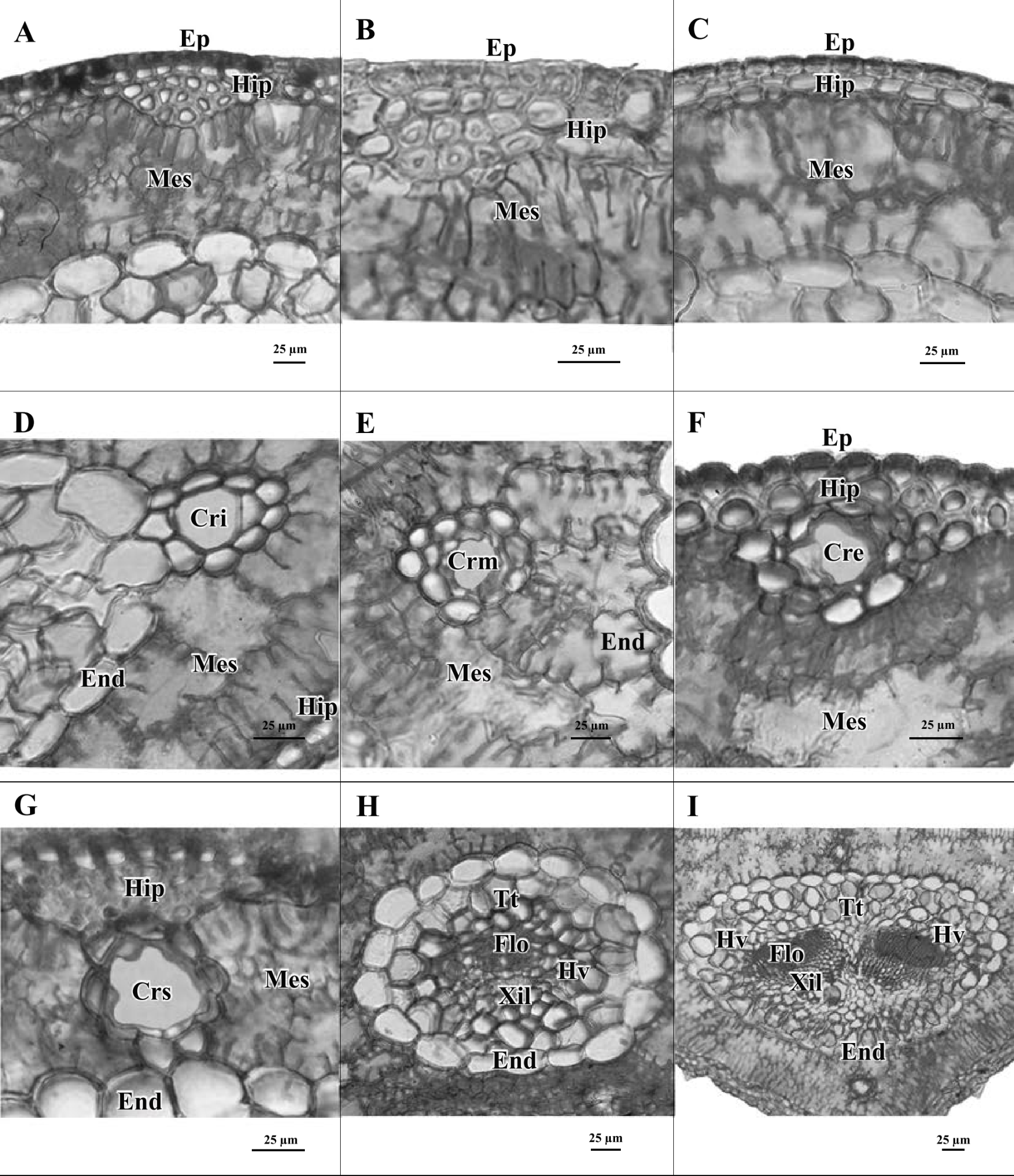 A = Pinus devoniana; B, E, I = P. teocote; C-D = P. greggii; F, H = P. cembroides; G = P. oocarpa; Cre = Canal resinífero externo; Cri = Canal resinífero interno; Crm = Canal resinífero medio; Crs = Canal resinífero septal; End = Endodermis; Epi = Epidermis; Flo = Floema; Hip = Hipodermis; Hv = Haz vascular; Mes = Mesófilo; Tt = Tejido de transfusión; Xil = Xilema.