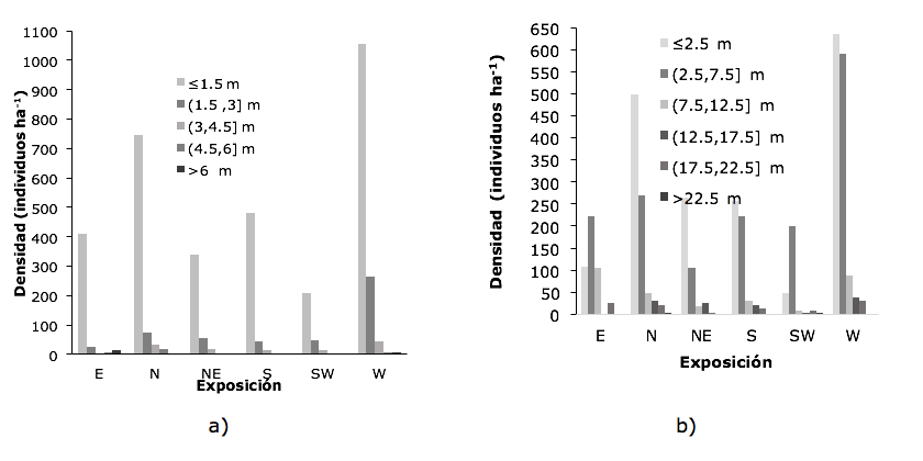 In the present work, a greater density of individuals with diameters <2.5 cm in the horizontal structure was quantified in all exposures, followed by diameters greater than 2.5 and less than 7.5 cm, very related to the heights that were more pronounced in the west exposure (Figure 1b); this is explained by the frequency of individuals with higher diameters, which decreases as they reach greater dimensions, which means that the smaller diameter classes will always be more abundant.