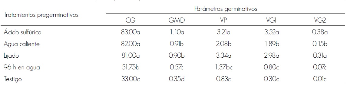 Existieron diferencias significativas entre los tratamientos pregerminativos probados para todos los parámetros evaluados (P<0.0001), lo que coincide con otros trabajos realizados anteriormente en E. cyclocarpum y otras latifoliadas (Somarriba y Ferreiro, 1984; Hernández et al., 2001).