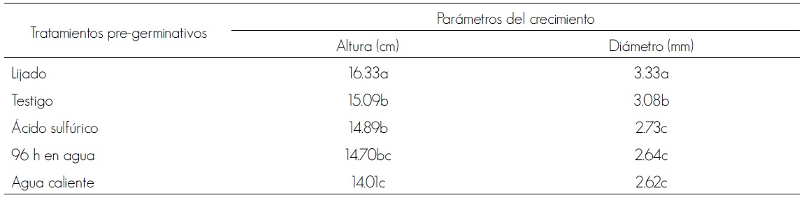 Existieron diferencias significativas entre los tratamientos pregerminativos para las variables del crecimiento (p<0.0001). De manera similar, Sánchez y Ramírez (2006) confirmaron lo anterior en el crecimiento en altura de plántulas de Leucaena leucocephala evaluadas al mes de edad.