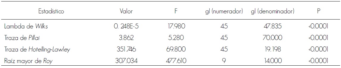 Todos los estadísticos del análisis multivariado mostraron diferencias estadísticas altamente significativas (p<0.0001) entre los tratamientos germinativos (Cuadro 3), lo que reafirma las resultados generados por el análisis univariado (ANOVA) de cada variable por separado. Esto significa que, con base en los parámetros germinativos, incluidos los días de inicio y de máxima germinación, así como la altura y diámetro a los seis meses, los tratamientos pregerminativos son estadísticamente diferentes entre sí.