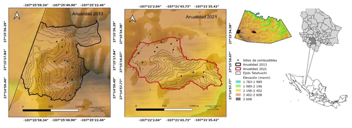 A lo largo del tiempo, los incendios forestales han modelado la forma y estructura de los ecosistemas forestales; uno de los elementos esenciales para su ocurrencia son los combustibles forestales, que pueden ser alterados para incidir en el comportamiento del fuego. El objetivo de esta investigación fue evaluar la carga de combustibles forestales muertos en dos áreas con aprovechamiento maderable y diferente cobertura vegetal (anualidades 2013 y 2021). Para la estimación de combustibles leñosos se utilizó la técnica de intersecciones planares; la hojarasca y la capa de fermentación fueron recolectadas y deshidratadas para el cálculo del peso. Los promedios para las anualidades 2013 y 2021 fueron de 43.21 Mg ha-1 y 55.22 Mg ha-1, respectivamente. Los resultados mostraron que la carga de combustibles leñosos fue superior en la anualidad 2013, pero la capa orgánica fue mayor en la anualidad 2021. El material liviano (hojarasca y fermentación), acumuló la mayor cantidad de combustible total en ambas anualidades con 61.46 y 76.53 %, respectivamente. La alta proporción de combustible en la capa orgánica implica el desarrollo de estrategias para su manejo, ya que se considera clave para el inicio de un incendio; si se consideran los efectos del cambio climático, se espera que los incendios aumenten su frecuencia.